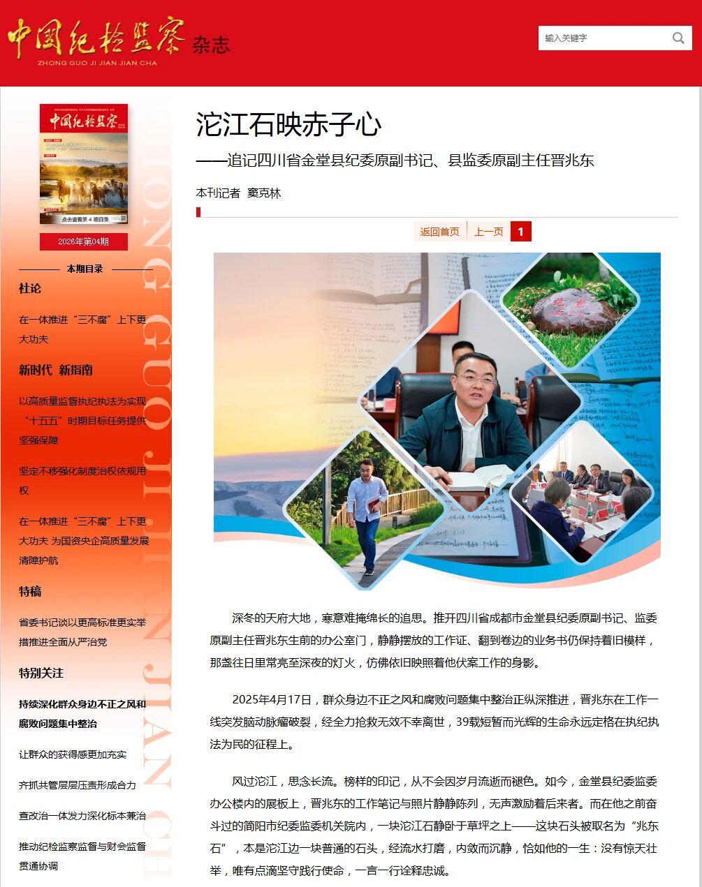 《中国纪检监察杂志》2026年第4期“铁军风采”栏目刊发《沱江石映赤子心——追记四川省金堂县纪委原副书记、县监委原副主任晋兆东》。