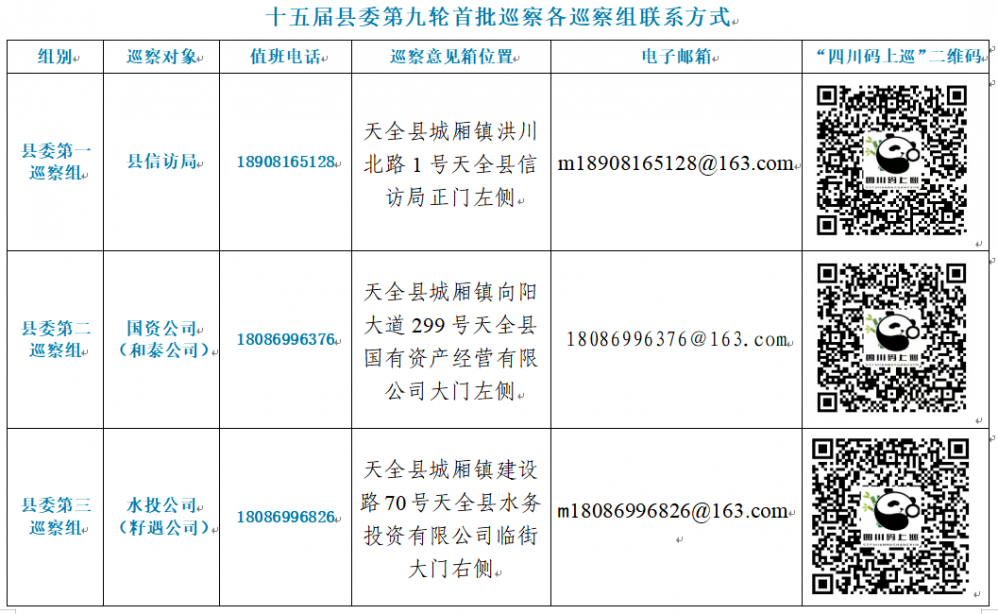 巡察期间,县委各巡察组设置了值班电话、电子邮箱、巡察专用意见箱和“四川码上巡”二维码。巡察组主要受理反映被巡察党组织领导班子及其成员、下一级党组织主要负责人,以及重要岗位人员问题的来信、来电、来访,重点是关于违反政治纪律、组织纪律、廉洁纪律、群众纪律、工作纪律和生活纪律以及中央八项规定精神等方面的问题反映。对其他不属于巡察受理范围的信访问题,将按规定由被巡察单位和有关部门认真处理。